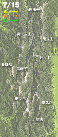 大沢小屋から、十分も森林帯を行くとすぐ雪渓になる。始めはゆるいが、段々と傾斜も増して来る。向うの山稜には、明るい山稜が照っているが、谷間は未だだ。Gさんは、どんどん行ってしまう。Kさんは、まだ見えぬ。雪渓の端に水が流れている。水を飲んで、アイゼンをつける。Kさんが来る。傾斜は、いよいよ急に、雪渓は二つに分れ、右へ登る。峠はすぐ目の上だ。もうすぐだ。ところが、さにあらず。三十分もかゝる。喜びに、来し方を見ると驚いた。よくも登ったと思う。さて、向うと見れば、槍から続く、二つの尾根が、はっきりしている。黒部五郎が黒部川におっかぶせるようにせまる。